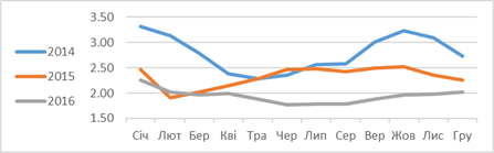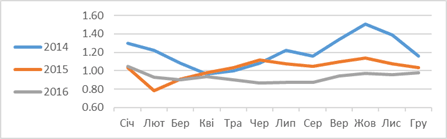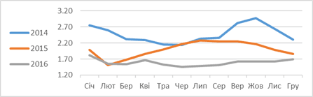 Отже середній індекс прибутковості яловичини у 2016 році був на 17% нижчим ніж у попередньому році, свинини – на 20%, курятини – на 9%. Також всі індекси були нижчими і в порівнянні з 2014 роком.
