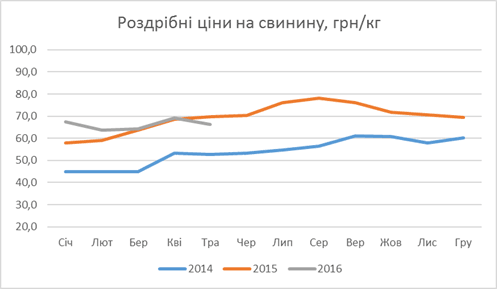 У той же час, на українському ринку ціни не втрималися після передвеликоднього підвищення і пішли вниз, втративши за травень у середньому 4 відсотки. Попит був вкрай розчаровуючим, враховуючи те, що нереалізовані запаси свинини на переробних підприємствах на 1 травня були в 1,5 рази більшими ніж торік.