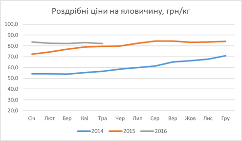 В Україні роздрібні ціни навпаки знизилися у середньому на 1% через вже традиційно низький попит. Пропозиція яловичини не піддається швидкому ринковому регулюванню, тим більше, що для більшості виробників виробництво м’яса є похідною від молочного виробництва, яке живе по своїм законам.