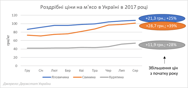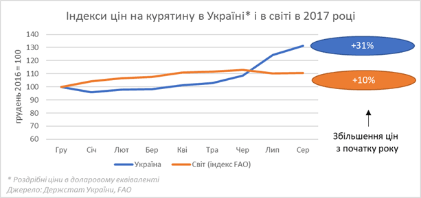 В рамках проекту FAO/EBRD з підтримки публічного діалогу в м’ясній галузі України ми розраховуємо індекс цін кормового міксу на базі основних кормових зернових і олійних шротів і потім зіставляємо його з цінами на м’ясо. Враховуючи те, що корми є головним елементом собівартості (їх частка доходить до 60-70%), то відношення ціни реалізації м’яса до ціни кормів являє собою показник маржинальності виробництва. Ми називаємо його індекс прибутковості. Так ось, у порівнянні з найгіршим 2016 роком цей індекс, розрахований для курятини, збільшився за перші вісім місяців цього року на 9%. У порівнянні з 2014 роком він був на 11% нижчим, а у порівнянні з середнім за 2014-2016 роки цьогорічна прибутковість виявилася на 1% нижчою. Тобто, якщо покращення прибутковості і відбувалося в останні три місяці, то загальна картина з початку року не така вже й весела і не дозволяє говорити про якісь надприбутки виробників курятини за рахунок українських споживачів.