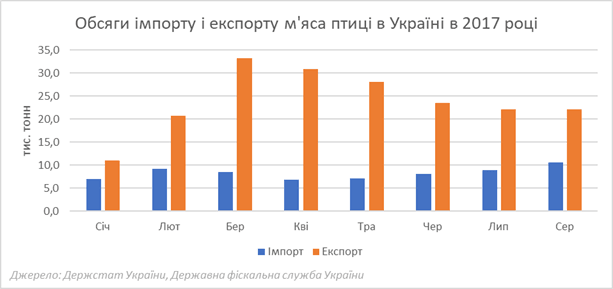 Другий факт: ціни на курятину в Україні зросли більше ніж на світовому ринку. З початку поточного року доларовий еквівалент ціни на тушку в українському роздробі збільшився на 31%, а індекс FAO світових цін на м’ясо птиці (http://www.fao.org/fileadmin/templates/est/COMM_MARKETS_MONITORING/Meat/Documents/2016_MeatPriceIndices_totalseries.xls) – на 10%. Тут прихильники держрегулювання мали б радісно вигукнути: «Ось вона зрада і є!», але я знов мушу нагадати ринкову аксіому про те, що товар йде туди, де вищі ціни і, в результаті, ситуація швидко вирівнюється. Україна є не тільки експортером курятини, а ще й її імпортером, отже, якщо в нас відбувається якійсь перекіс цін на внутрішньому ринку, є закордонні партнери які завжди готові допомогти. І заробити собі грошей, звичайно. Тоді зростання цін на українському ринку в черні-серпні мало б відобразитись в зменшенні нашого експорту і збільшенні імпорту? Саме так! (далі є відповідна діаграма). Тож, без курятини ми точно не залишимось.
