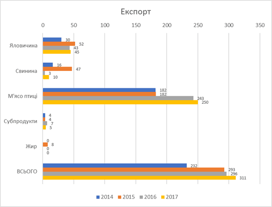 Примітка: Дані не співпадають з торгівельною статистикою оскільки переведені у забійну вагу (для яловичини і свинини); експорт м’ясних продуктів переведений у складові.