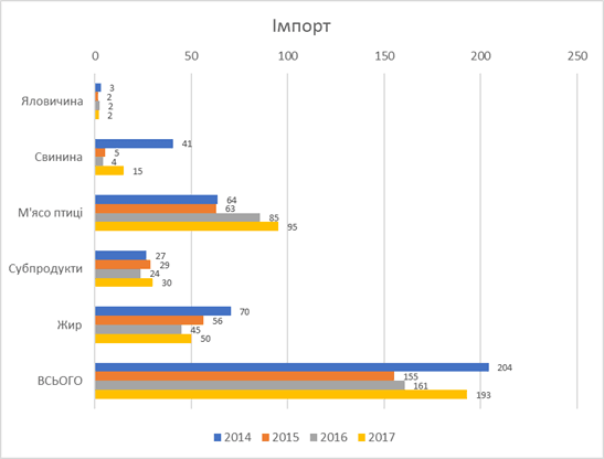 Незважаючи на успіхи в експорті, Україна завжди залишалась імпортером м’яса і субпродуктів. Завозилося дешеве м’ясо механічного обвалювання, свинячі субпродукти і сало для виробництва ковбас і інших продуктів.