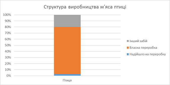 Частка власної переробки птиці, згідно з даними статистики, складає близько 80% і це приблизно дорівнює частці промислового виробництва птиці. Отже майже всі птахоферми в нас мають власні переробні потужності.